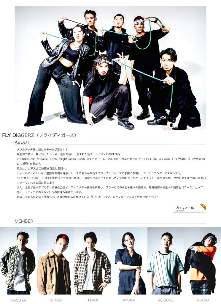ダブルダッチは、アメリカ・ニューヨークで生まれたスポーツ。縄跳びとダンスを融合して、どれだけ美しく、楽しく、クールに跳べるか、チームワークを駆使してテクニックを競い合うところに魅力があります。競技人口も増加傾向にあって、日本国内だと30万人以上、世界でも60カ国以上に普及しています。そして、彼は、現在、ダブルダッチプロチーム「FLY DIGGERZ(フライディガーズ)のメンバーとして活躍中です。